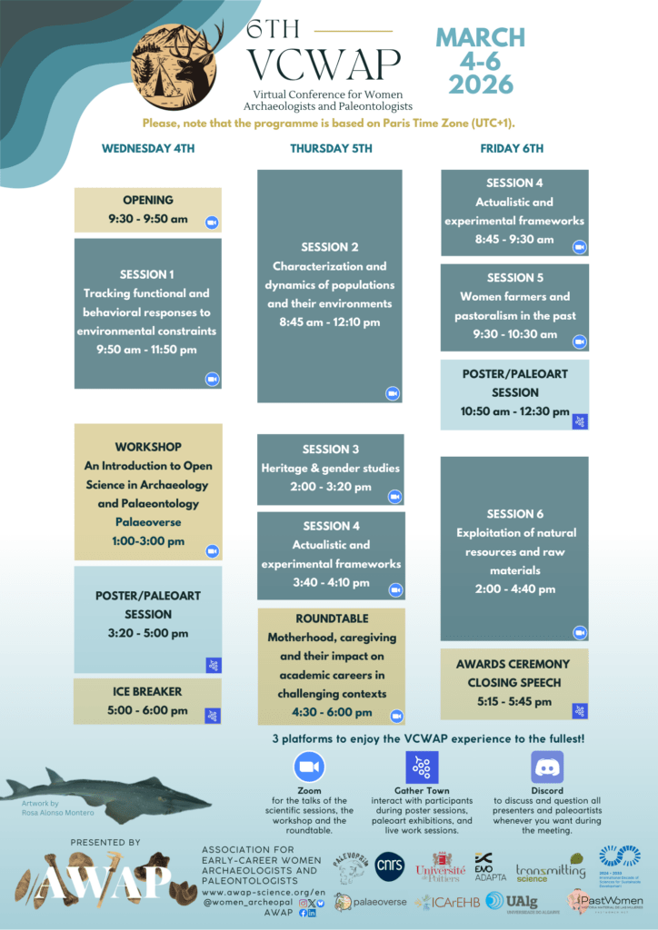 The VCWAP welcomes contributions from early-career women (cis and trans) researchers in Archaeology and Paleontology, without permanent positions (from master students to postdoctoral stages included). It covers several aspects of ancient life (plants, fungi, invertebrates, vertebrates including humans), their interactions, as well as the study of materials, environments, and climates, and must involve methodologies used in Archaeology and/or Paleontology.